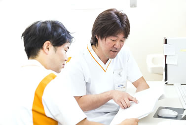 マッサージを行いながら患者さんの状態のご確認を行います。緊張をほぐし、リラックスした状態でリハビリテーションを行っていきます。